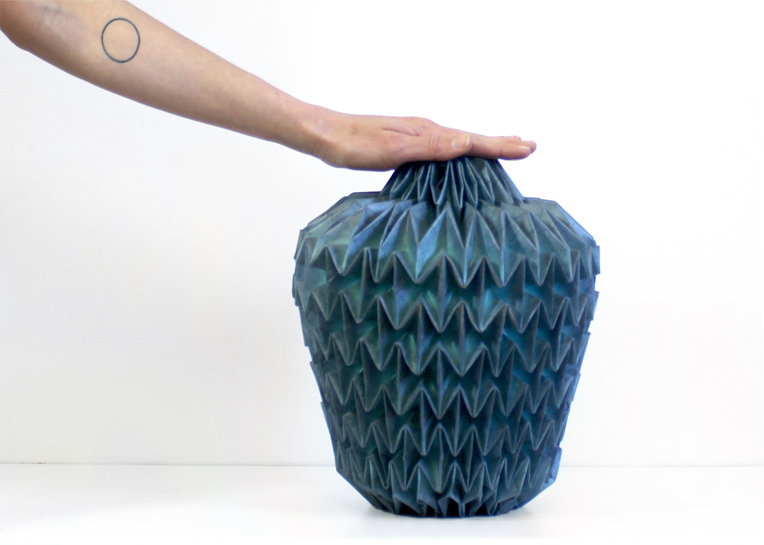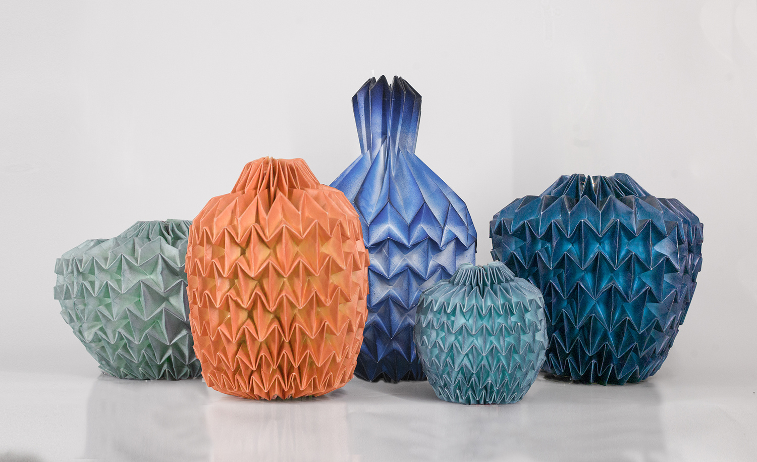Unfolded Vases are transforming vases made from Tyvek paper, a tear- and waterproof sythetic fibre paper.Lightweight and flexible. The intricate and rich textural qualities of folds and pleats change material qualities and add a layer of three dimensionality and complexity.